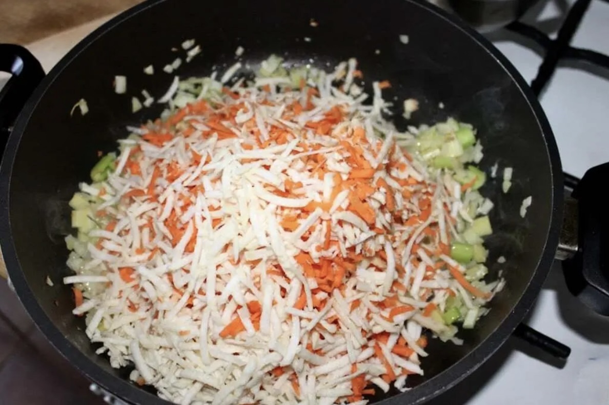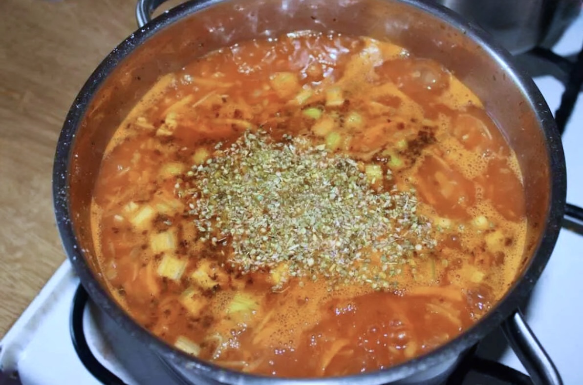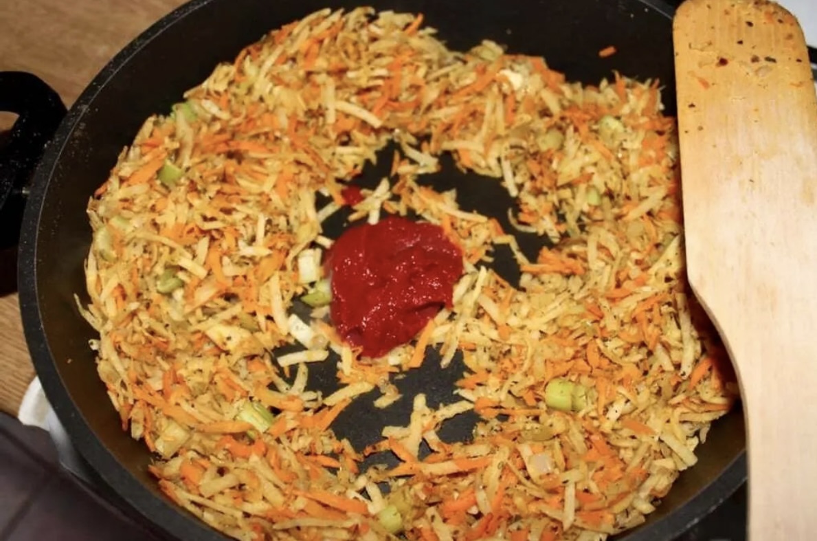 Smażenie: Na patelni rozgrzej oliwę z masłem klarowanym. Zeszklij seler naciowy i cebulę. Następnie dodaj starte warzywa korzeniowe oraz zmiażdżony czosnek. Dopraw obficie oregano i ziołami prowansalskimi. Dodaj koncentrat pomidorowy, sól i pieprz. Duś na małym ogniu przez 5-10 minut, aż warzywa zmiękną.