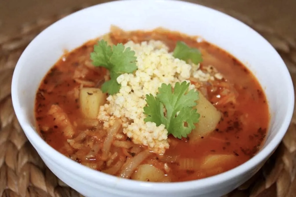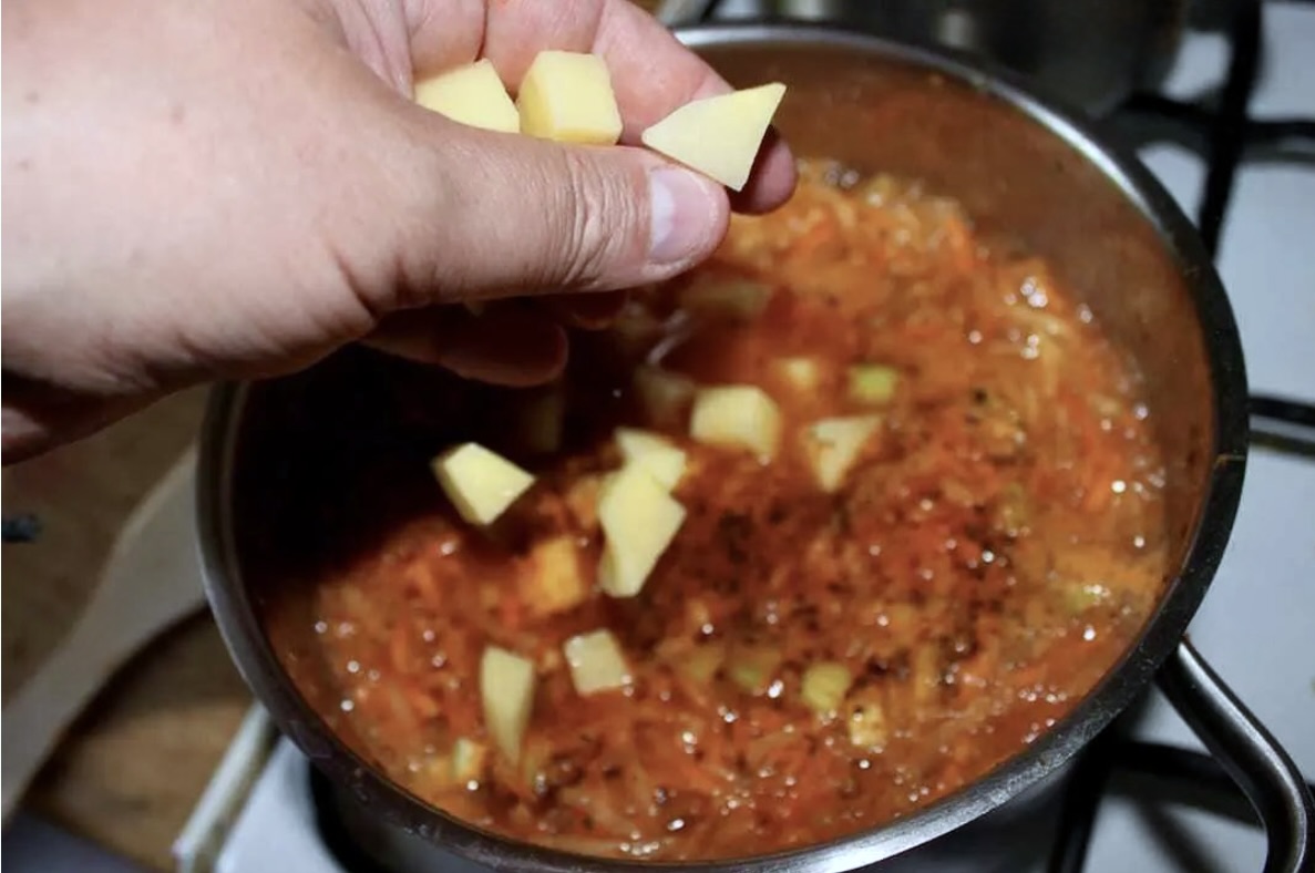 Gotowanie zupy: Zawartość patelni przełóż do dużego garnka, a następnie zalej wrzątkiem (ilość zależy od preferowanej gęstości). Wrzuć pokrojone ziemniaki. Dopraw słodką i ostrą papryką. Gotuj ok. 7 minut, aż ziemniaki będą miękkie.
