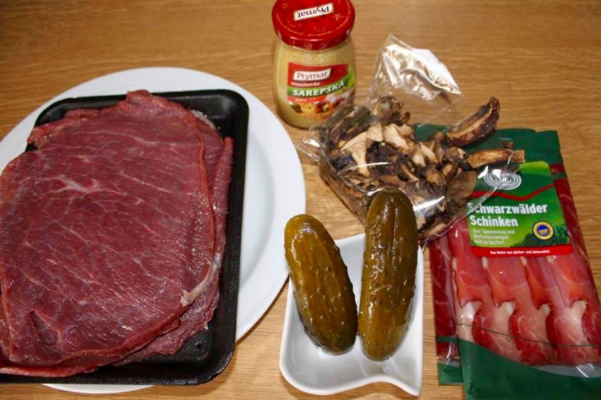 Moje zrazy wołowe z sosem grzybowym przygotowałem z udźca wołowego, choć lepiej ponoć wykorzystać tzw. krzyżową (zrazówka). Plastry wołowiny posmarować należy musztardą, obłożyć plastrami szynki dojrzewającej i kawałkami ogórka kiszonego, a następnie zawinąć w rolady i dusić wolno w sosie z grzybami do miękkości zrazów. Zrazy wołowe to danie zbliżone do klasycznych zrazów wielkopolskich, jednakże z nieco inną nutą smakową. Decyduje o tym inne nadzienie. Od jakości wołowiny zależy w tym daniu wiele, ale i szynka (element nadzienia) winna być najwyższej jakości. Chodzi szczególnie o to, by szynka ta była wędzona naturalnym dymem, dzięki czemu sos grzybowy zyska niesamowitego smaku. Zrazy wołowe to danie doskonałe na specjalne okazje. Na co dzień wymaga bowiem zbyt dużo pracy i zajmuje sporo czasu.