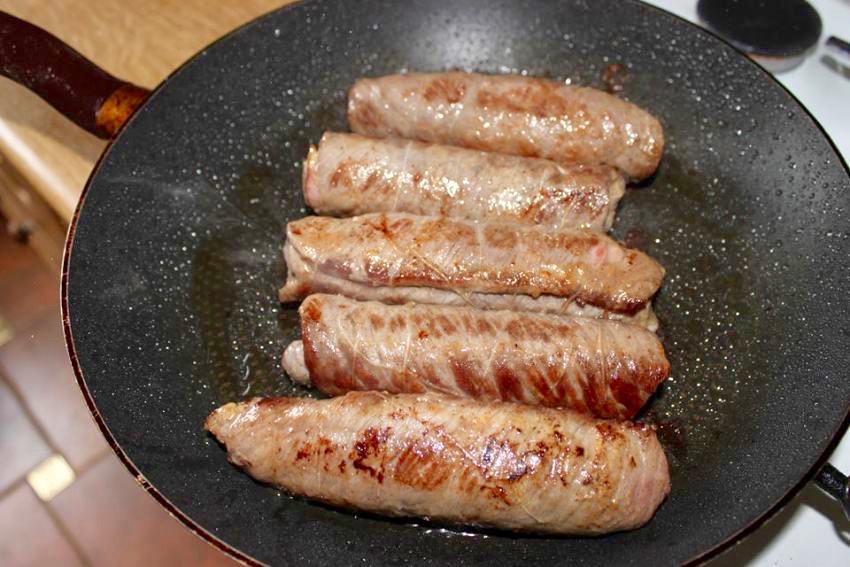 Smaż zrazy na patelni na mocnym ogniu na niewielkiej ilości oliwy, aż ładnie się zrumienią.