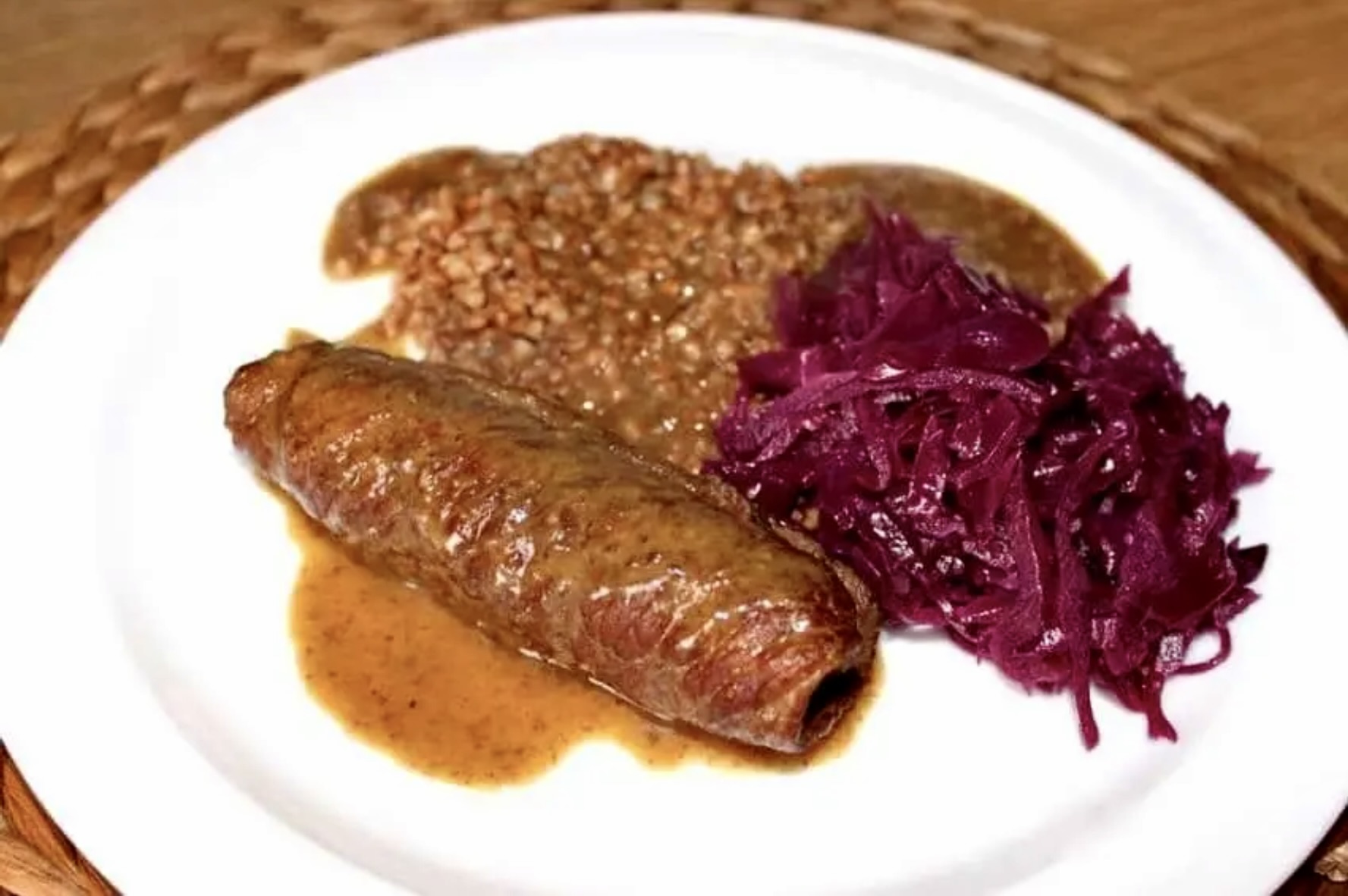 Zrazy wołowe podawaj np. z kaszą gryczaną polaną aromatycznym sosem grzybowym i duszoną czerwoną kapustą (zobacz przepis na modra kapusta).