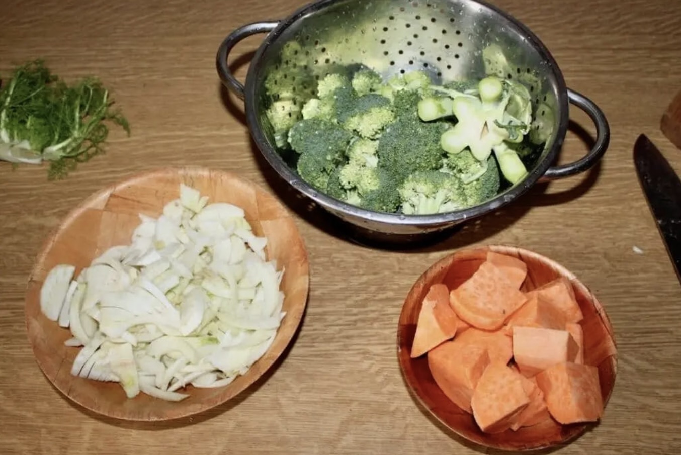 Przygotowanie warzyw: Batata obierz i pokrój w grubą kostkę, koper włoski pokrój w paski, a brokuła podziel na różyczki.