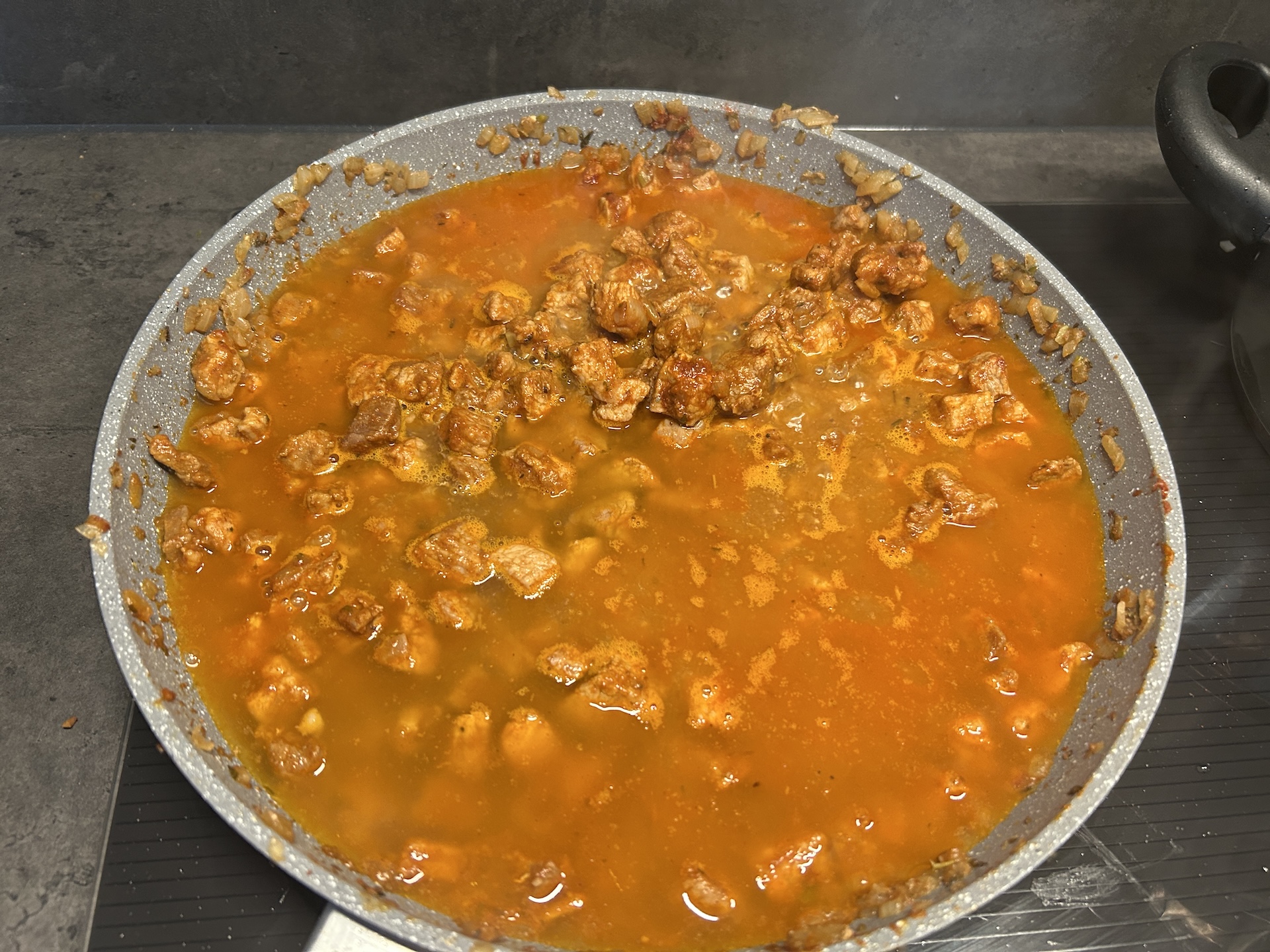 Gotowanie: Przełóż zawartość patelni do garnka, dolej wrzącej wody i gotuj na wolnym ogniu przez około 1 godzinę, aż mięso będzie miękkie.