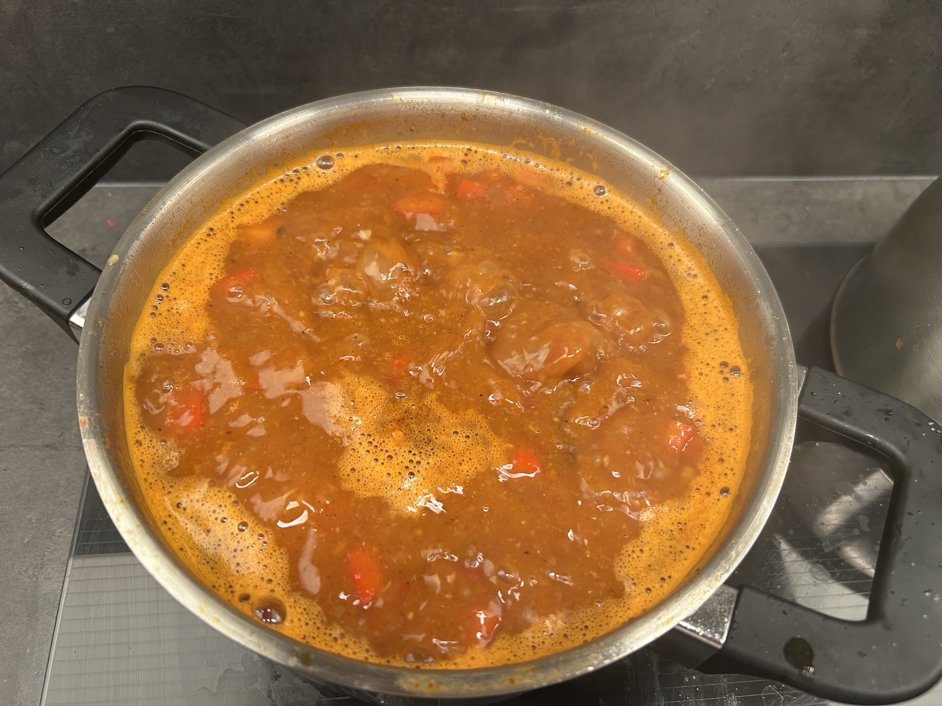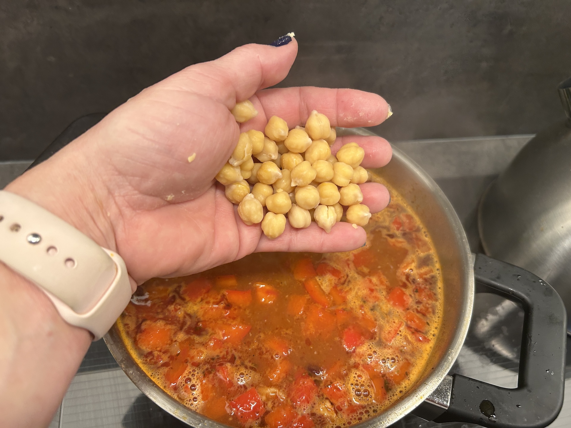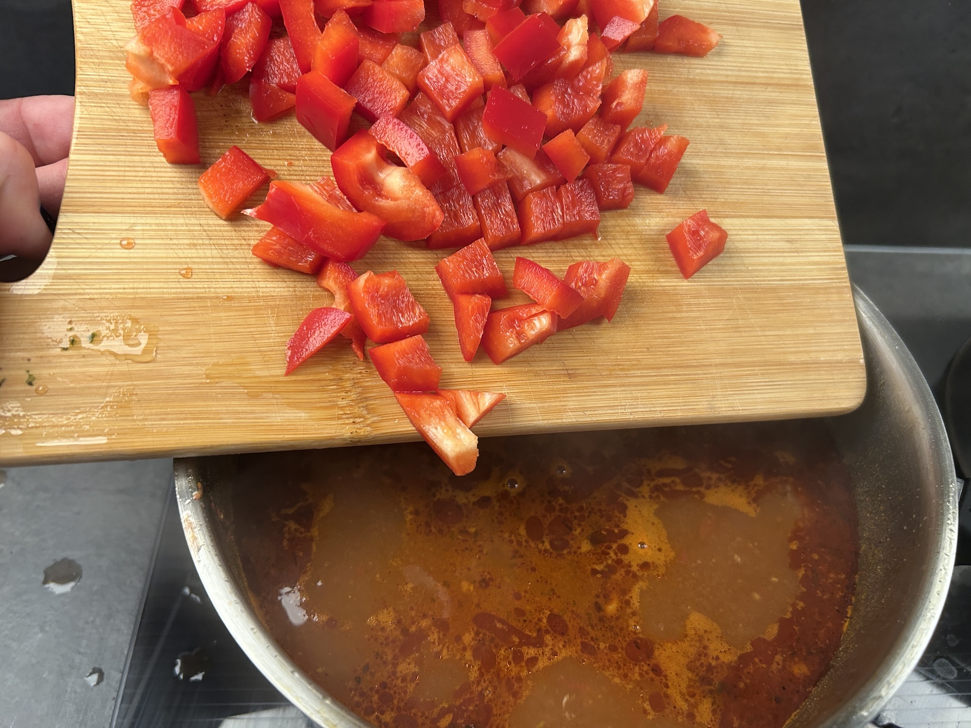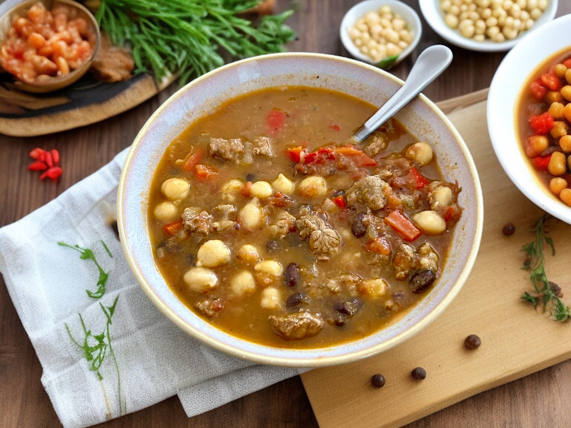 Dodawanie pozostałych składników: Gdy mięso jest już miękkie, dodaj do zupy pokrojoną paprykę, przecier pomidorowy, fasolę oraz całą i zmiażdżoną wcześniej ciecierzycę.