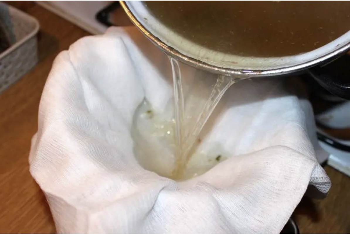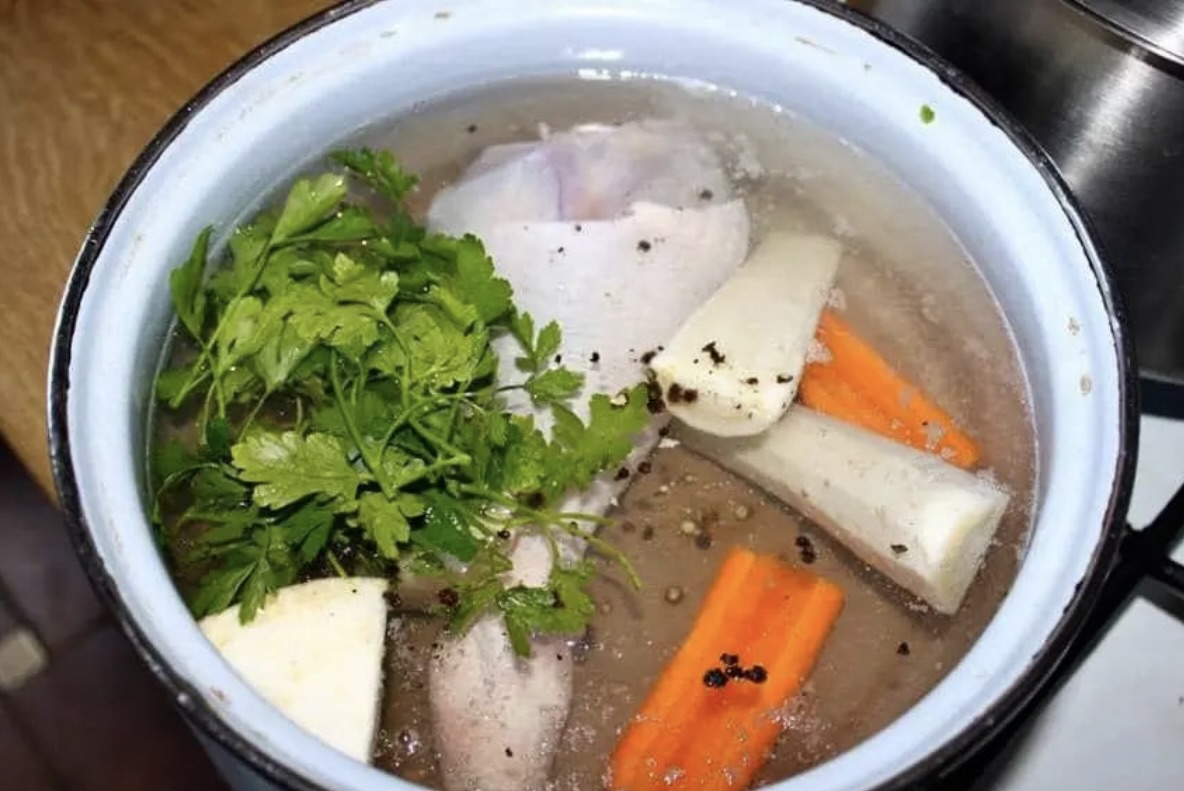 Przygotowanie wywaru i mięsa: Ugotowane mięso wyjmij, ostudź, oddziel od kości i skóry, a następnie podziel na małe kawałki. Wywar przecedź przez gazę i wlej z powrotem do garnka. Zagotuj.