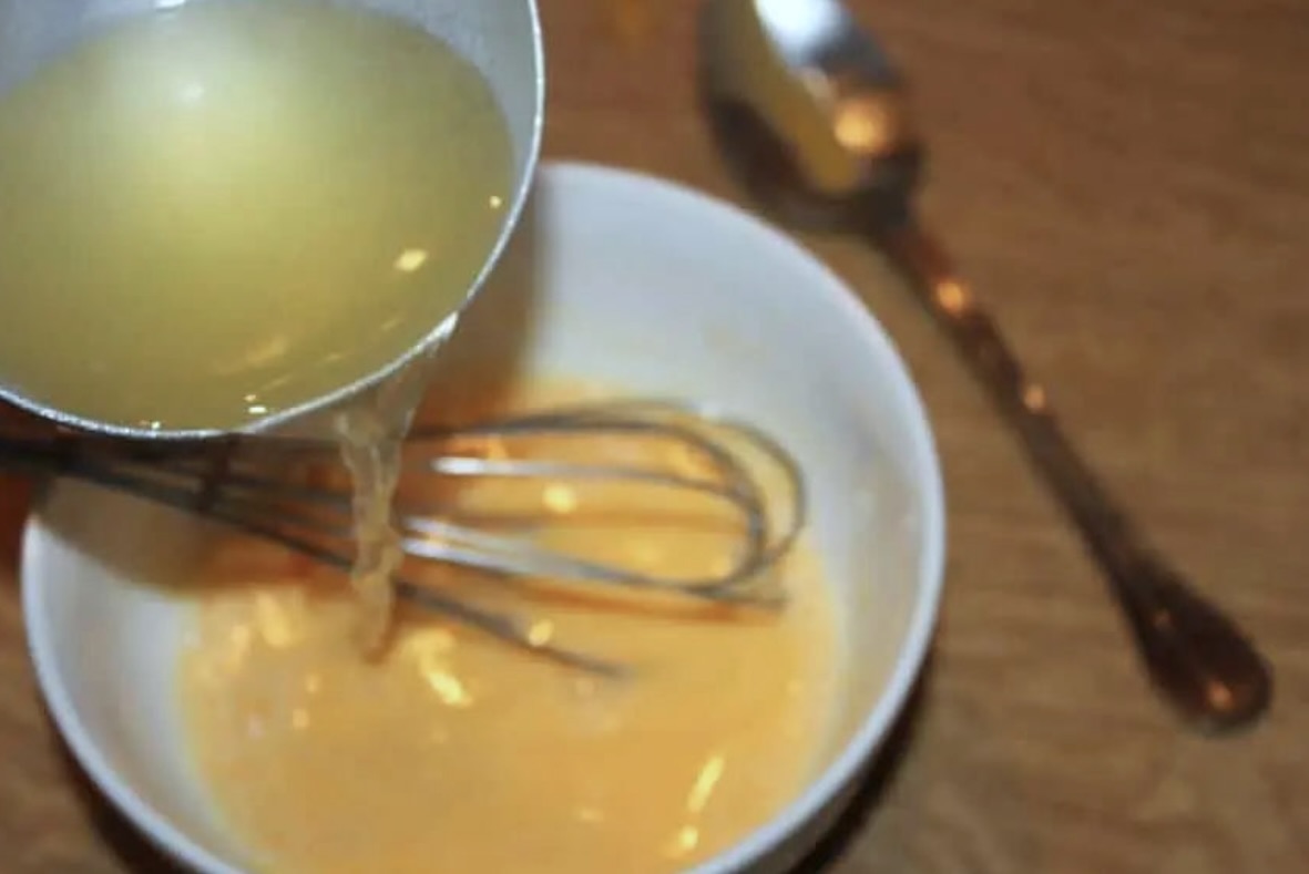 Zahartowanie zupy: W małej miseczce umieść trzy żółtka i wyciśnij do nich sok z połowy cytryny. Mieszaj nieustannie, aby żółtka się nie ścięły. Wlej chochlę letniego wywaru do masy jajeczno-cytrynowej, cały czas mieszając.