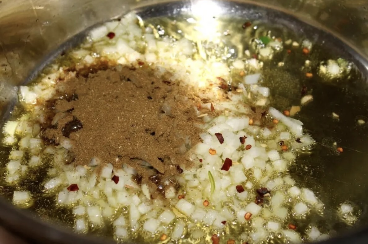 W dużym garnku rozgrzej 2-3 łyżki oliwy. Wrzuć cebulę, kmin rzymski oraz chili. Smaż ok. 2 minuty, aż aromaty się uwolnią, a cebula zeszkli.