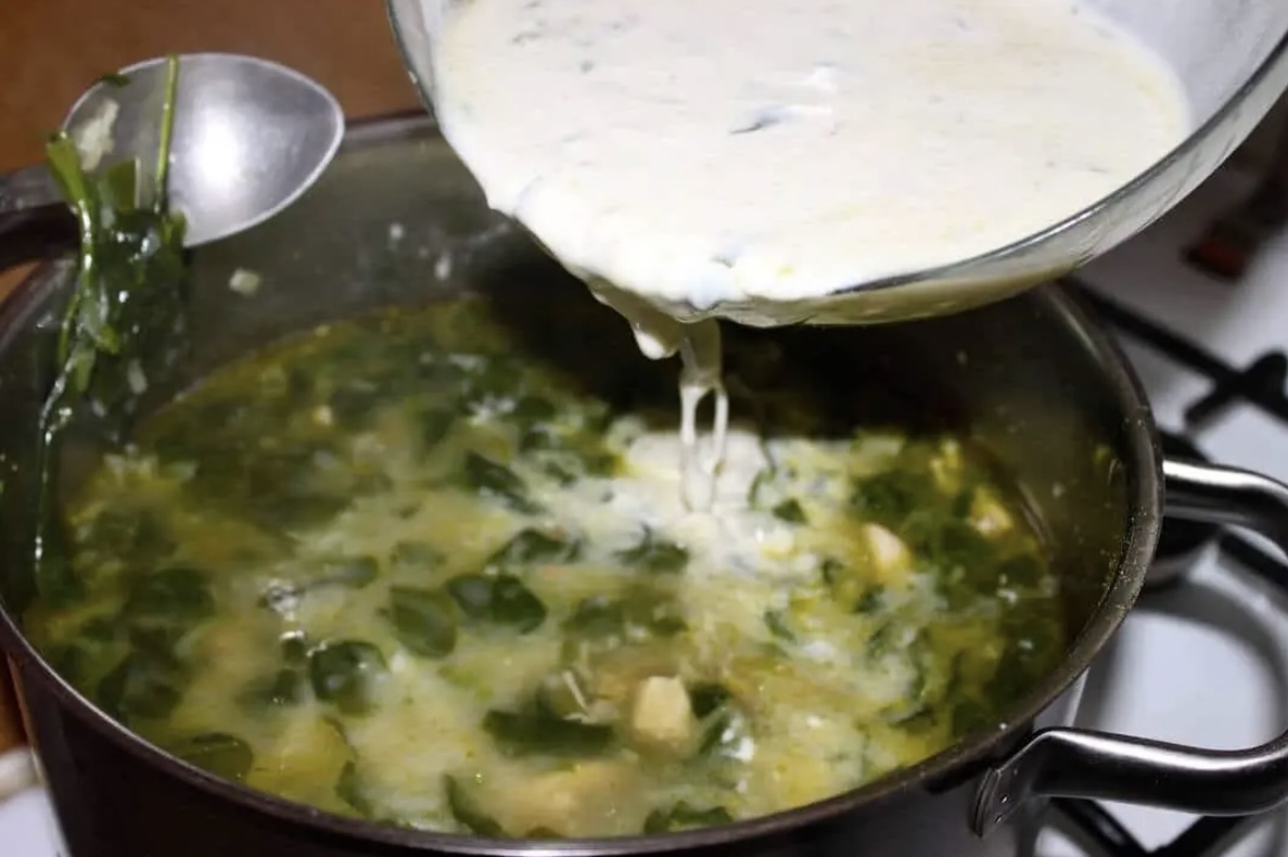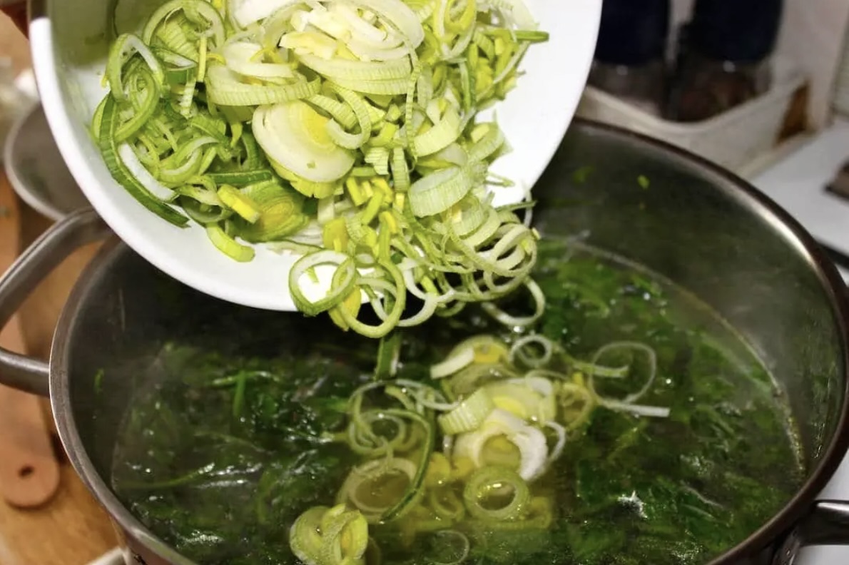 Do garnka ze szpinakiem wlej 3 szklanki przygotowanego bulionu oraz 2 szklanki gorącej wody.