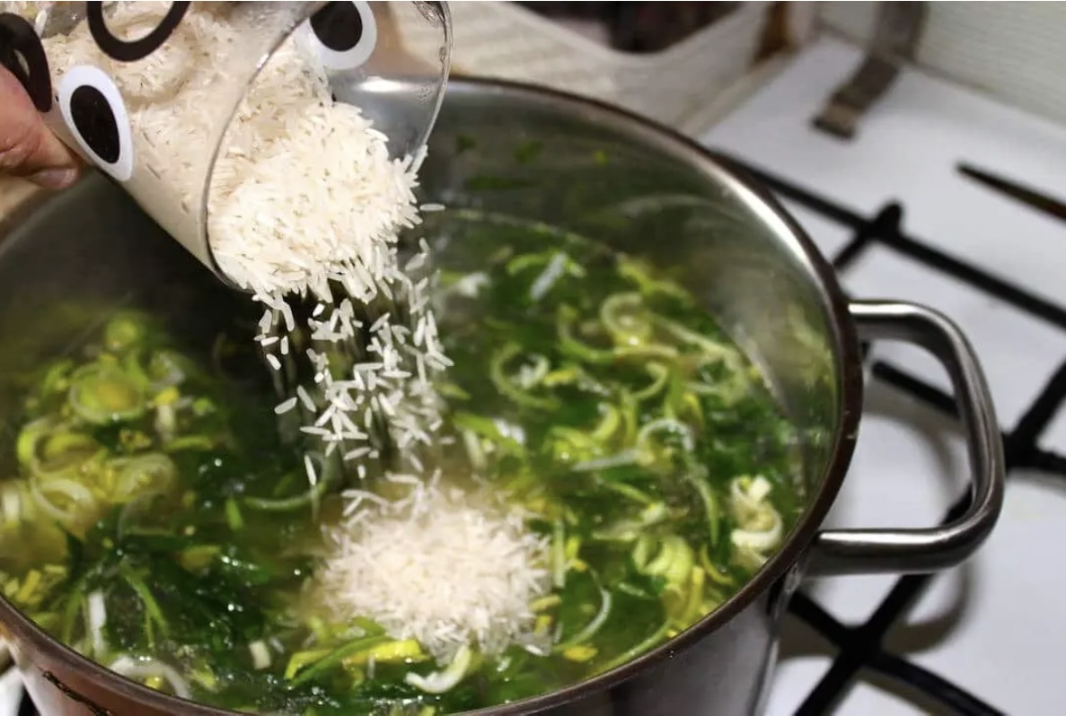 Dodaj pokrojonego pora oraz 100 g surowego ryżu.