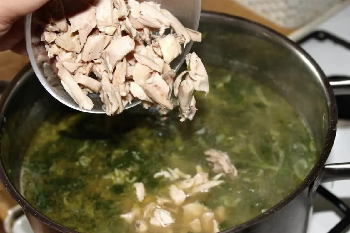 Dodaj do zupy wcześniej posiekane mięso z kurczaka. Wyłącz ogień.