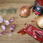 Warzywa: 1-2 cebule, 1 puszka pomidorów, 10 ząbków czosnku