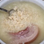 Pierwsze gotowanie (1 godzina): Przełóż fasolę do garnka i zalej 2 litrami zimnej wody. Dodaj plaster surowego, wędzonego boczku (ok. 150 g) oraz ryż (ok. 150 g). Doprowadź do wrzenia, zdejmij szumowiny („fusy”), a następnie zmniejsz ogień do minimum. Przykryj i gotuj przez 1 godzinę, od czasu do czasu mieszając.
