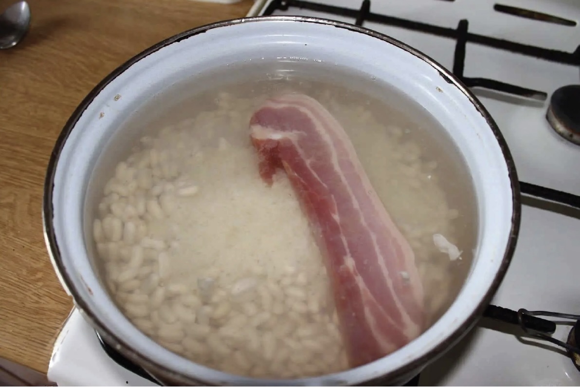 Pierwsze gotowanie (1 godzina): Przełóż fasolę do garnka i zalej 2 litrami zimnej wody. Dodaj plaster surowego, wędzonego boczku (ok. 150 g) oraz ryż (ok. 150 g). Doprowadź do wrzenia, zdejmij szumowiny („fusy”), a następnie zmniejsz ogień do minimum. Przykryj i gotuj przez 1 godzinę, od czasu do czasu mieszając.