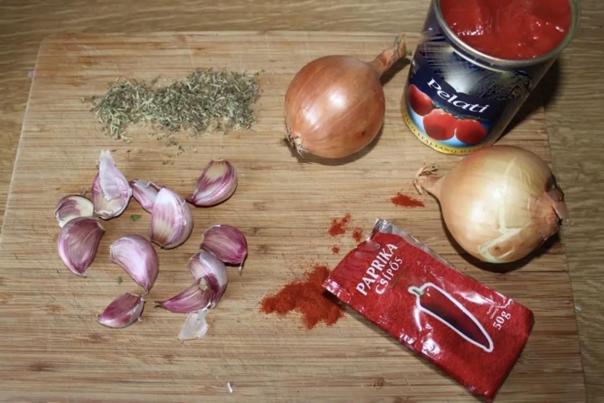 Warzywa: 1-2 cebule, 1 puszka pomidorów, 10 ząbków czosnku