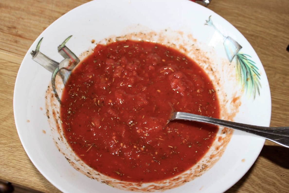 Przygotowanie dodatków: W tym czasie ugnieć pomidory z puszki, dodaj do nich paprykę, zioła prowansalskie, pieprz i sól, a następnie wymieszaj. Cebulę obierz i pokrój w grube piórka, a czosnek obierz i grubo posiekaj.