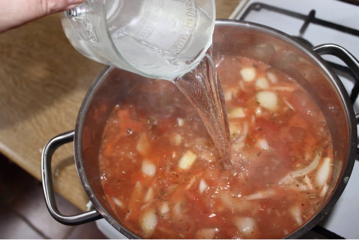Drugie gotowanie (1 godzina): Po godzinie dodaj do zupy pomidory z przyprawami, cebulę i czosnek. Wlej 500 ml wrzącej wody. Przykryj garnek i gotuj na wolnym ogniu przez kolejną 1 godzinę, co jakiś czas mieszając.