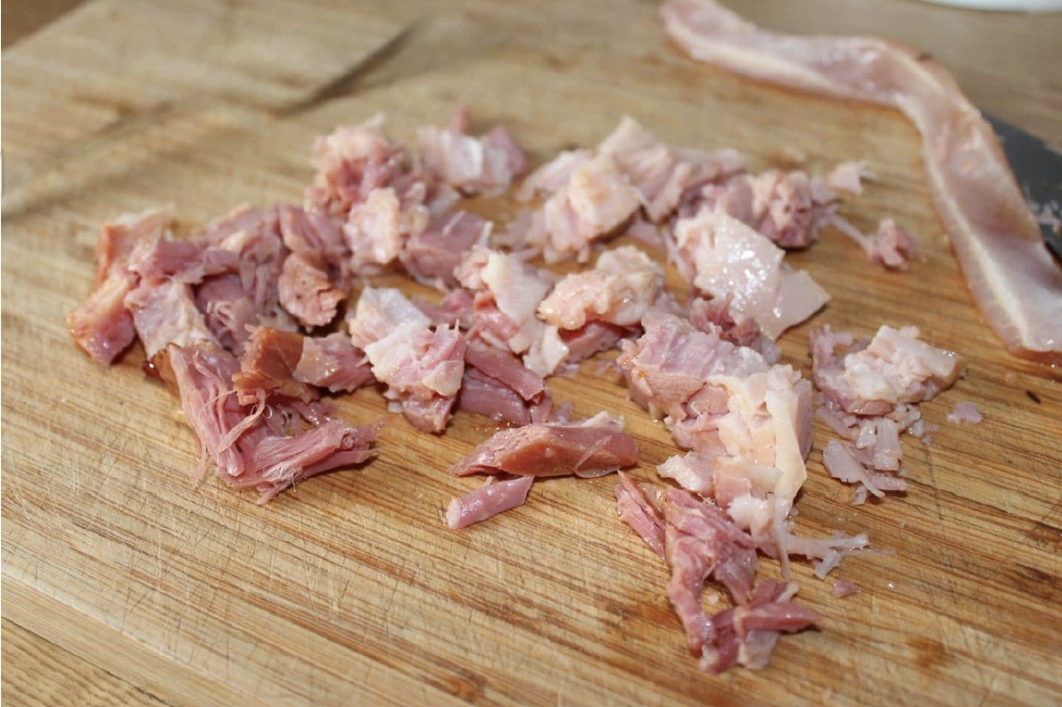 Gdy zupa będzie gotowa, wyjmij boczek i pokrój go na mniejsze kawałki, a następnie wrzuć z powrotem do zupy.