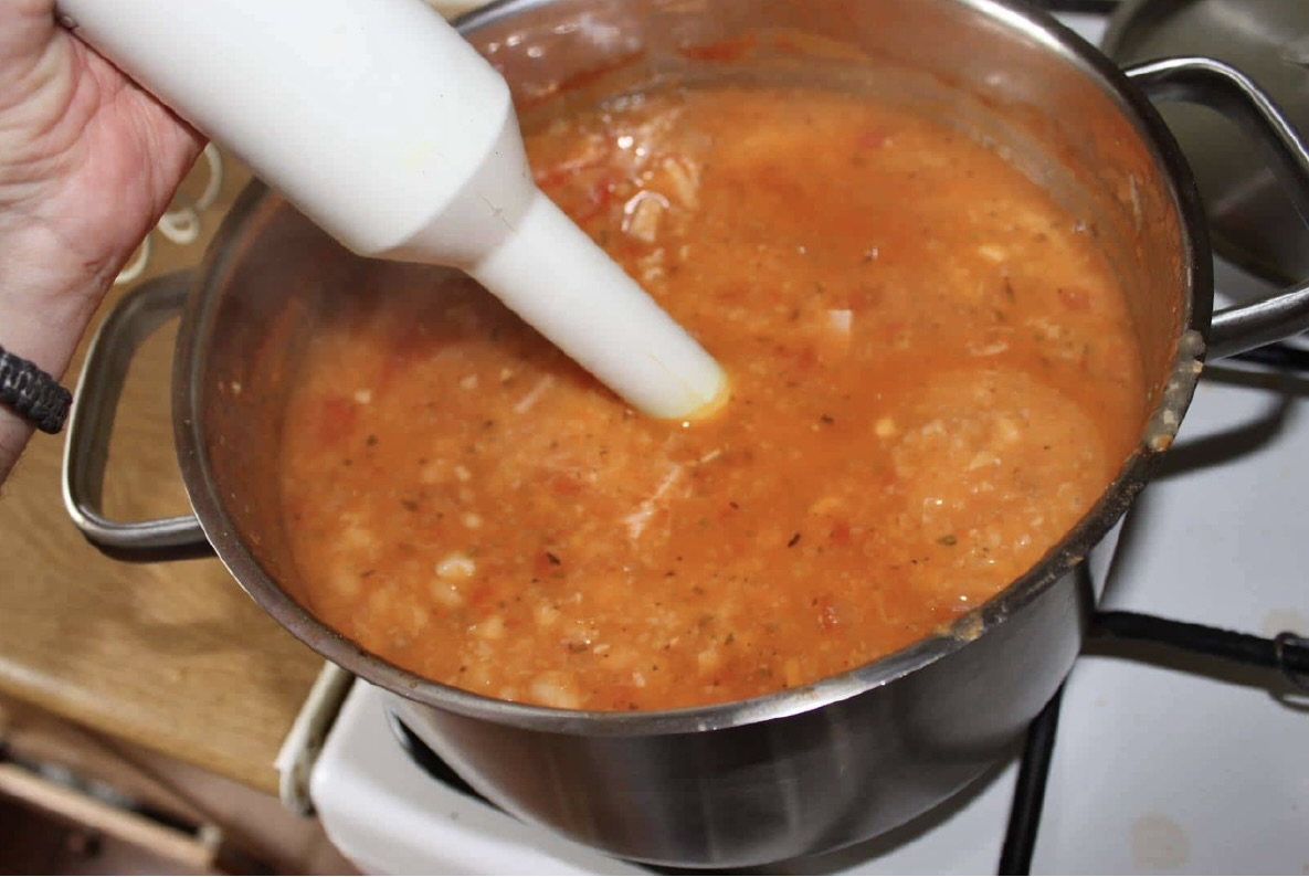 Zmiksowanie: Zmiksuj zupę blenderem ręcznym do pożądanej konsystencji (możesz zmiksować ją tylko częściowo, aby ją zagęścić, ale by część składników została w całości).