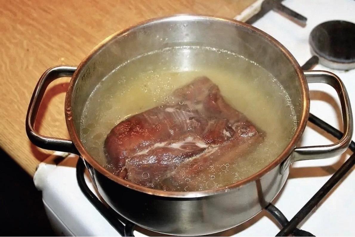 Ugotuj boczek w ok. 1 litrze wody na małym ogniu, aby uzyskać wywar (boczek po ugotowaniu nie będzie już potrzebny do zupy). Wywar ostudź, a następnie wstaw na noc do lodówki.