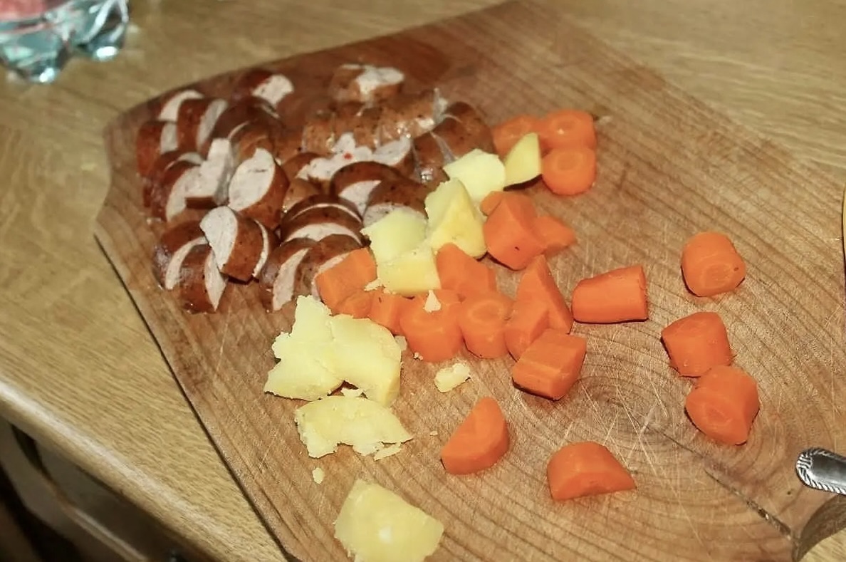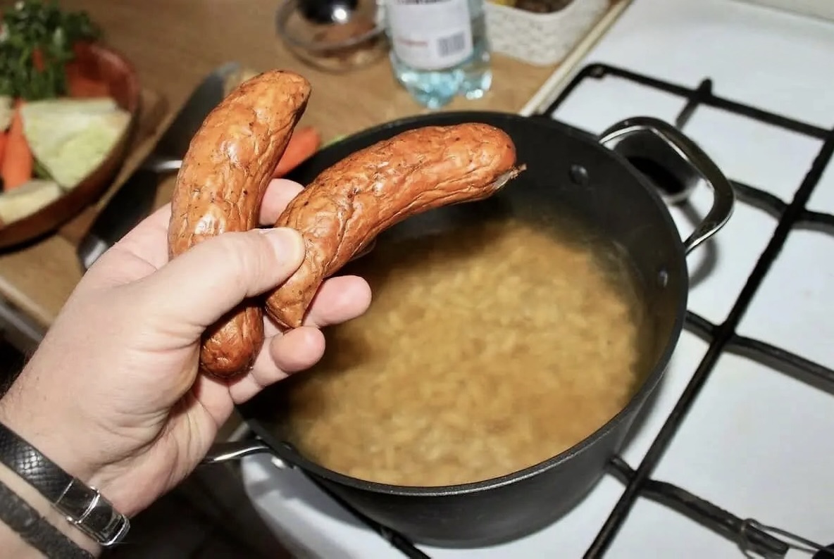 Wyjmij z zupy wszystkie warzywa i kiełbasę.