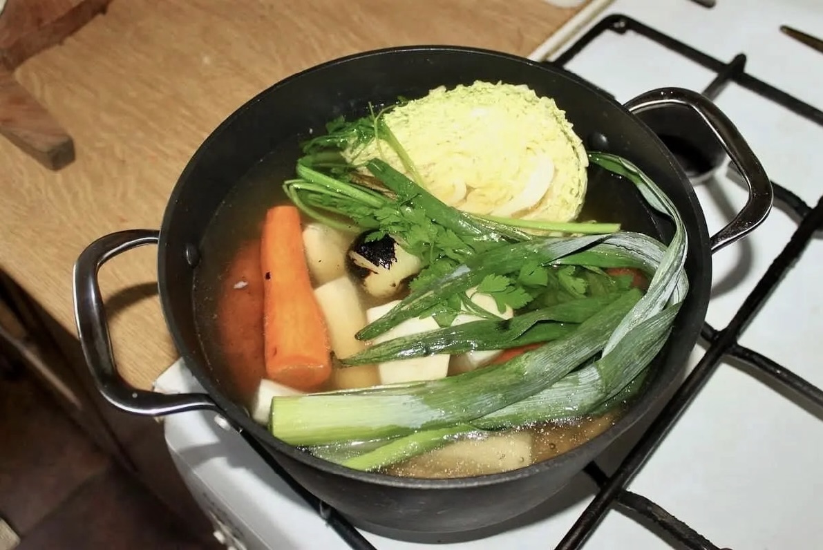 Warzywa: włoszczyzna (jak do rosołu) z kapustą włoską i porem, 3 duże ziemniaki, opalona cebula.