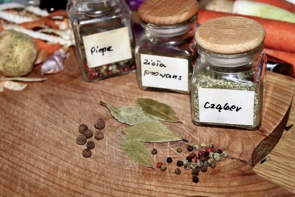 Przyprawy: 4 liście laurowe, 6 ziaren ziela angielskiego, 1 łyżeczka ziarnistego pieprzu, 2 łyżeczki cząbru, 2 łyżeczki ziół prowansalskich, sól, pieprz.