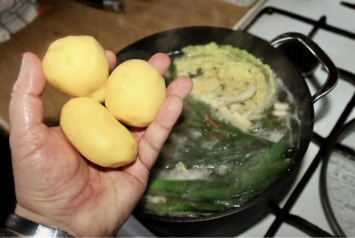 Dodaj obrane warzywa, opaloną cebulę, kapustę włoską, pora oraz przyprawy i sól. Do zupy wrzuć też obrane ziemniaki w całości.