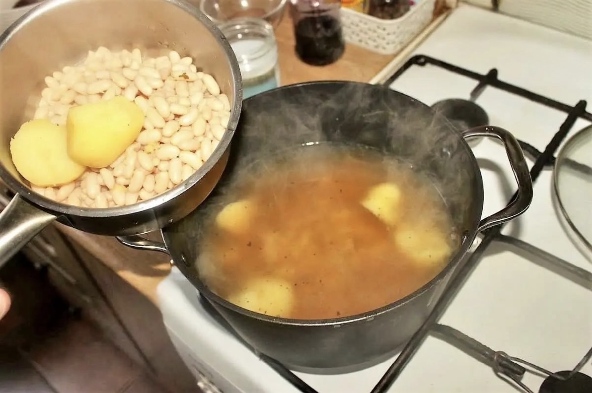 Odłóż na bok połowę ugotowanej fasoli oraz ziemniaki.