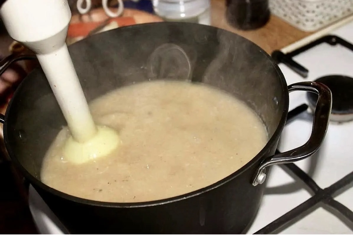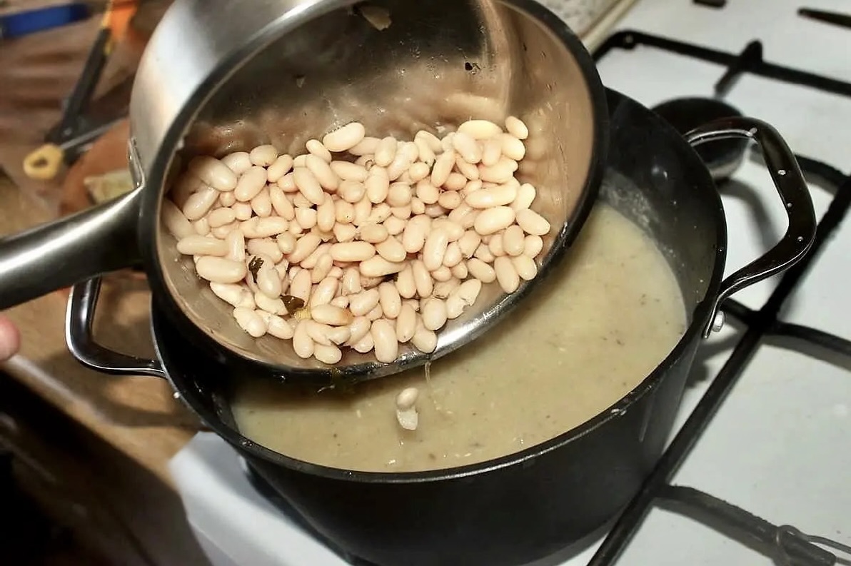 Pozostałą w garnku fasolę z wywarem zmiksuj blenderem na niezbyt gęsty krem.