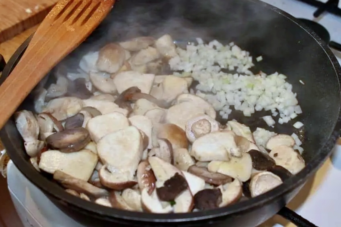 Na patelni rozgrzej 2 łyżki masła. Wrzuć połowę cebuli pokrojonej w kostkę oraz prawdziwki i kozaki. Następnie duś przez około 3 minuty.