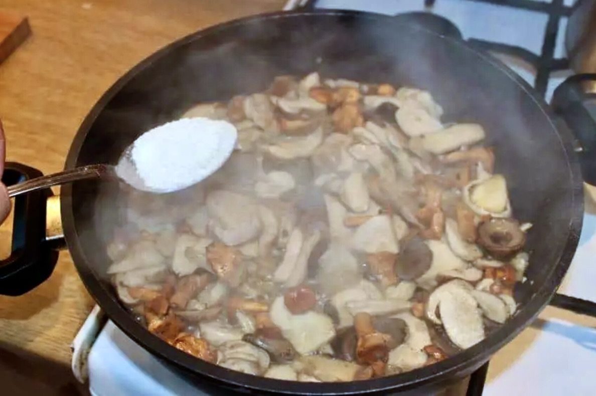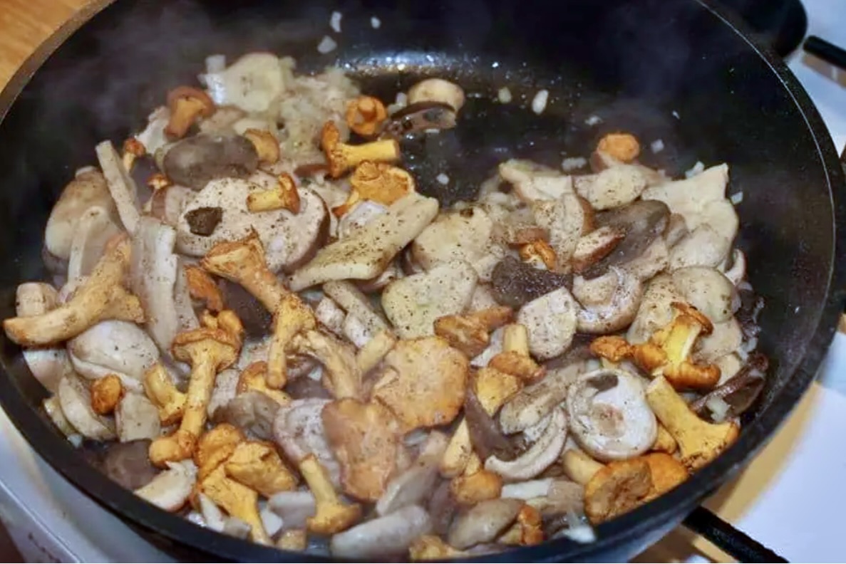 Dodaj kurki, dopraw solą i pieprzem, a następnie duś jeszcze kilka minut.