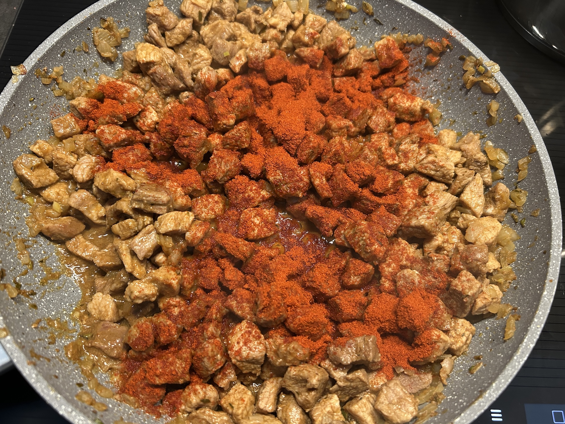 Zdejmij patelnię z ognia, wsyp mieloną paprykę, wymieszaj i podsmażaj jeszcze przez około minutę (uważaj, by nie przypalić papryki, bo zgorzknieje).