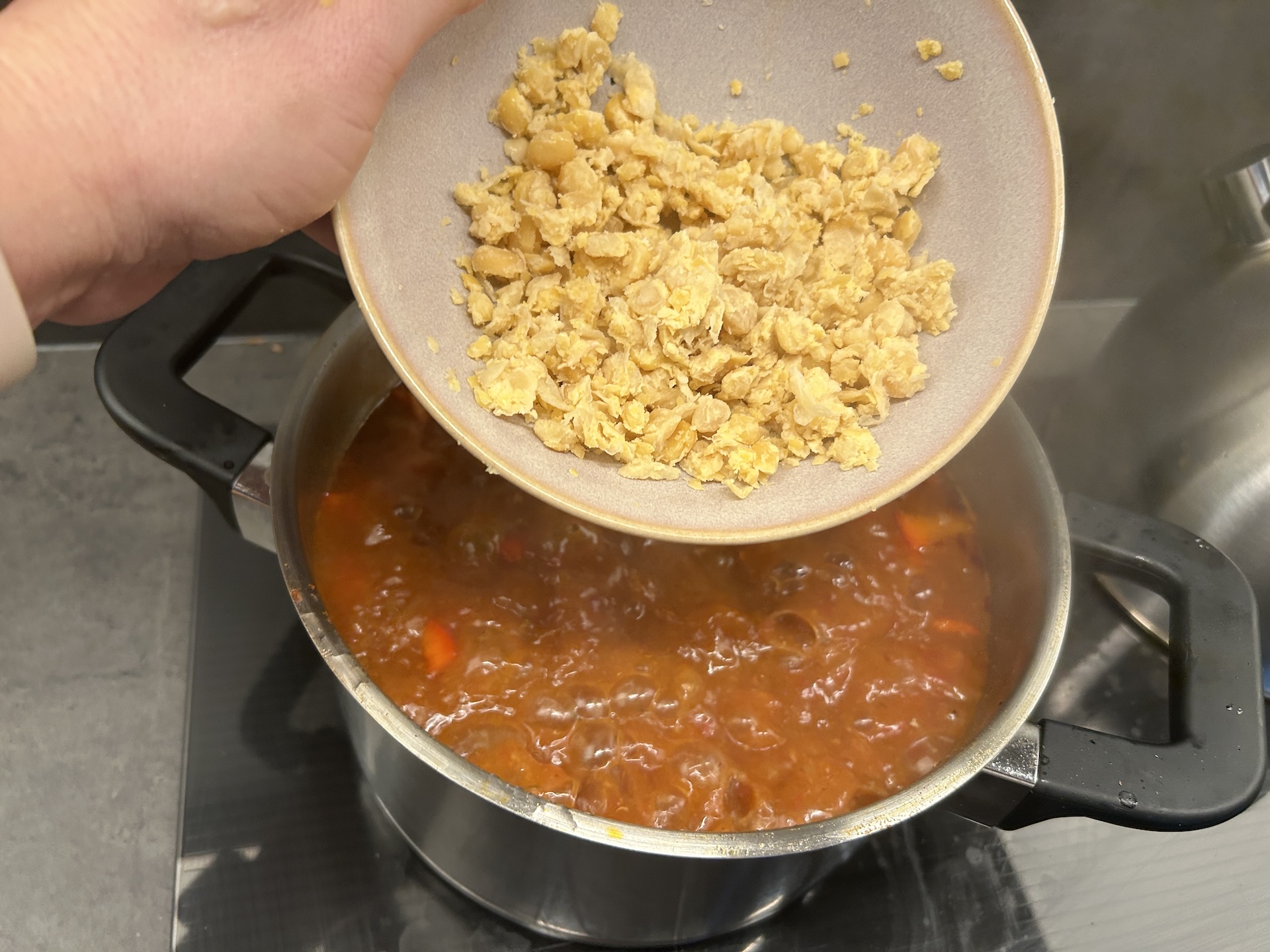 Na koniec dodaj odcedzoną ciecierzycę z puszki. Zagotuj całość i dopraw do smaku solą oraz pieprzem.