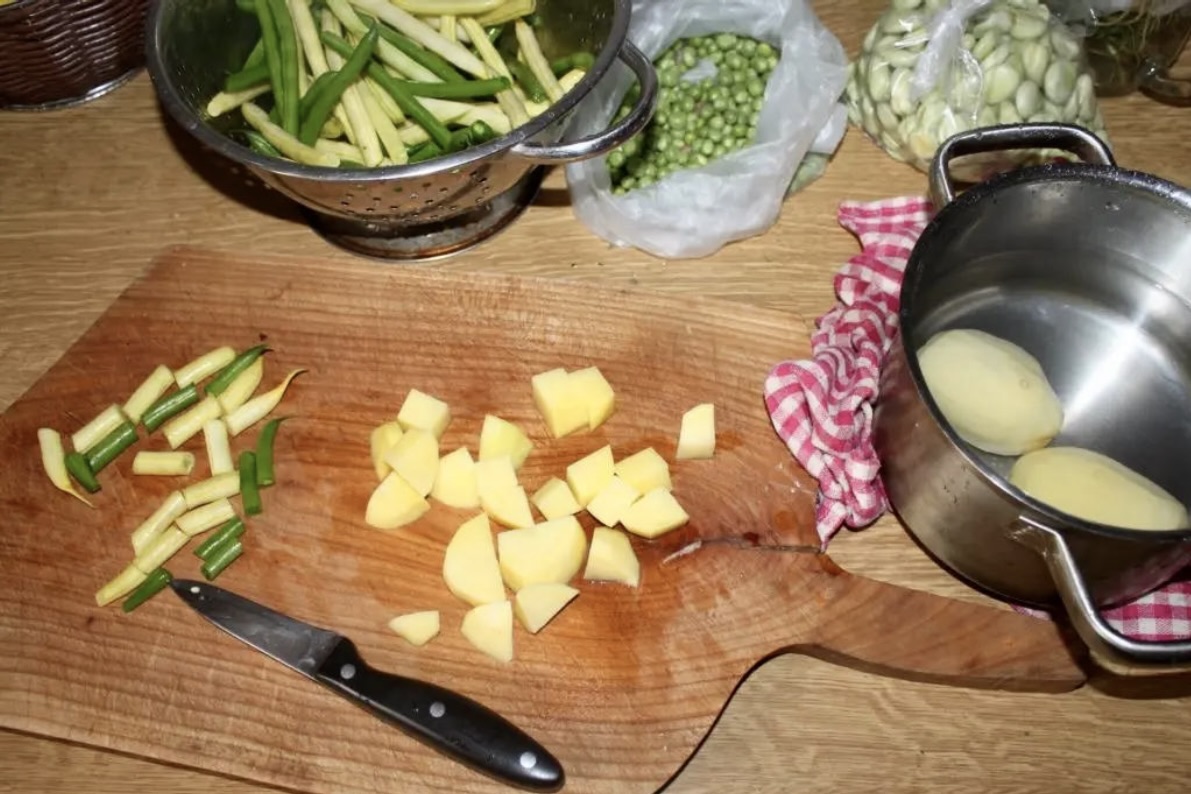 Bób opłucz. Jeśli jest młody, możesz go gotować bezpośrednio w zupie. Jeśli starszy – ugotuj go osobno w osolonej wodzie (ok. 10-15 min), odcedź i obierz z łupinek (dodasz go na samym końcu).
