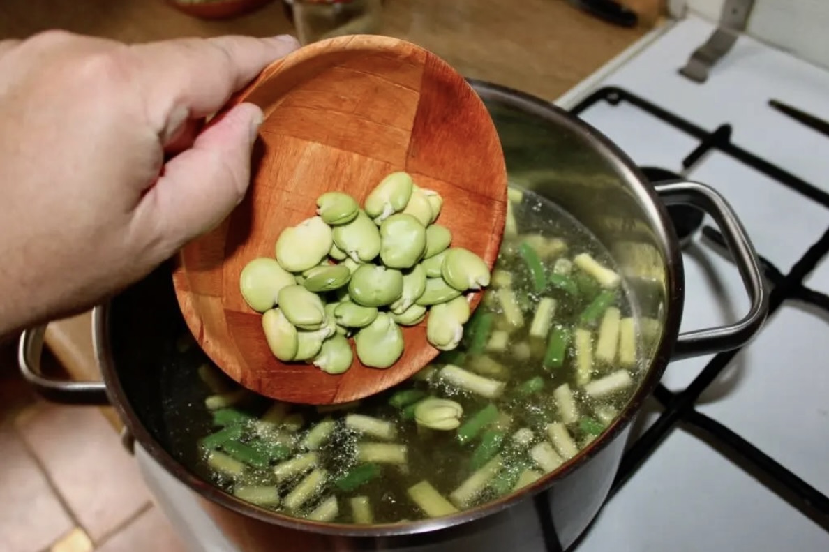 Jeśli bób był młody i nieobrany, dodaj go razem z fasolką. Jeśli używasz bobu już ugotowanego i obranego, wrzuć go do garnka teraz.