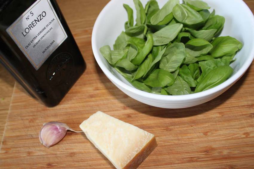Pesto: Wszystkie składniki na pesto (bazylię, ser, 1 ząbek czosnku, oliwę i sól) zblenduj. Jeśli masa jest zbyt gęsta, dolej oliwy – powinno być lekko lejące. Odstaw na bok, by smaki się „przegryzły”.