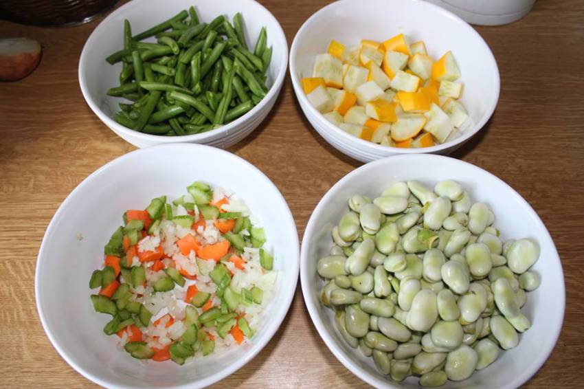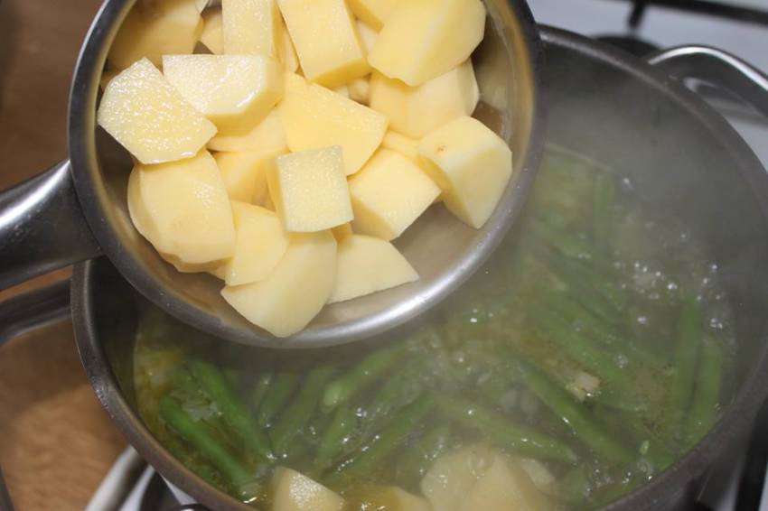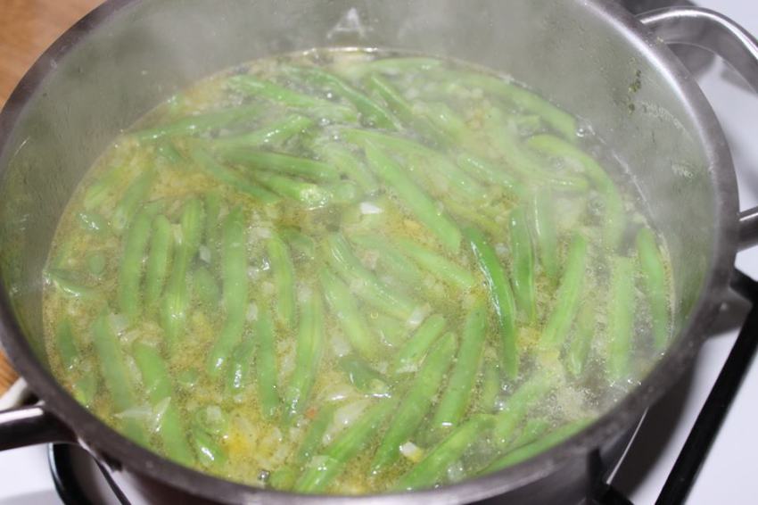 Zagotuj bulion w garnku. Dodaj podsmażone warzywa (soffritto) oraz oczyszczoną fasolkę szparagową. Gotuj 5 minut.