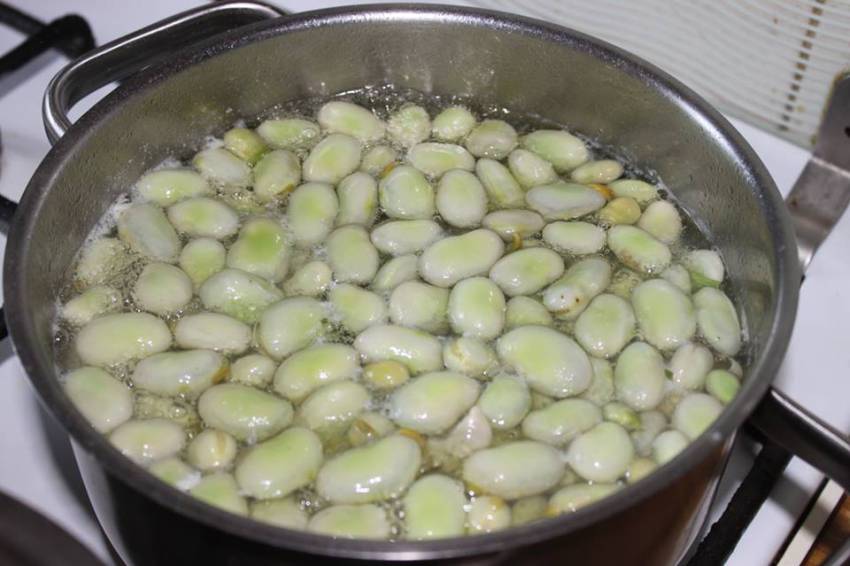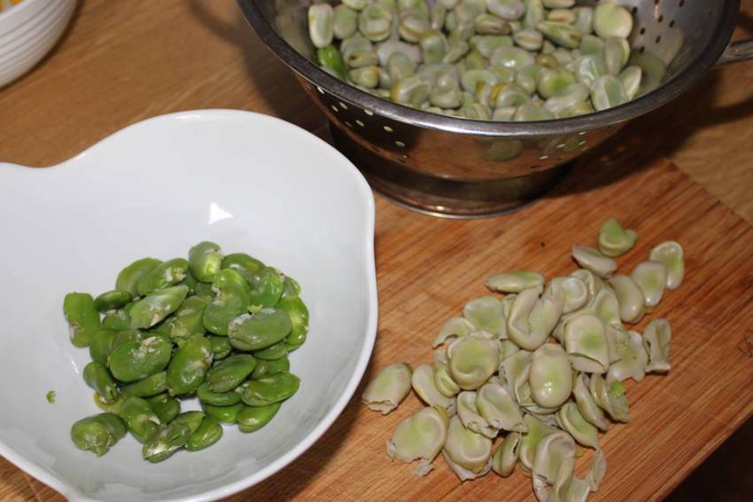 Bób: Wrzuć bób na wrzącą, osoloną wodę i gotuj 5 minut. Odcedź, a gdy lekko przestygnie, wyłuskaj go z łupinek.