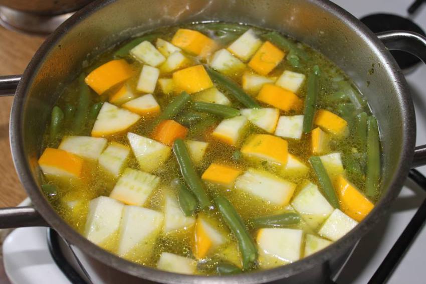 Dodaj pokrojoną w grubą kostkę cukinię. Gotuj wszystko jeszcze ok. 5 minut, aż wszystkie warzywa będą al dente (nie powinny się rozgotować).
