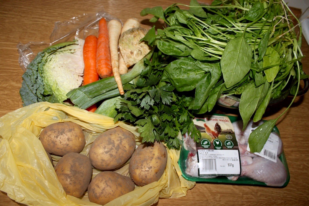 Warzywa: 250 g świeżego szpinaku, 2 większe ziemniaki, 1 marchewka, 1 pietruszka, kawałek selera korzeniowego, jarzyna jak do rosołu (do wywaru).