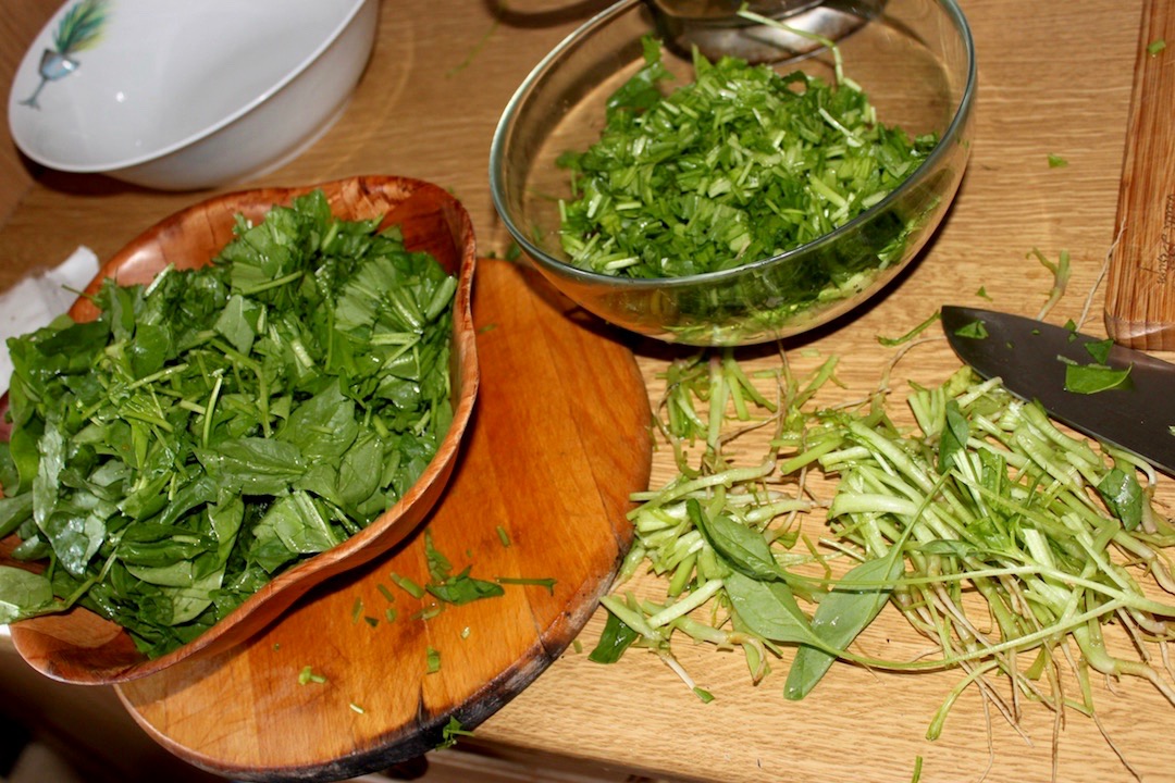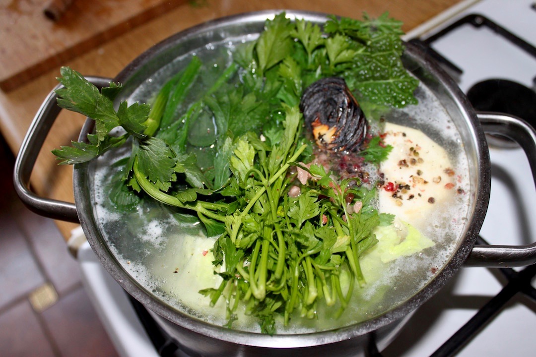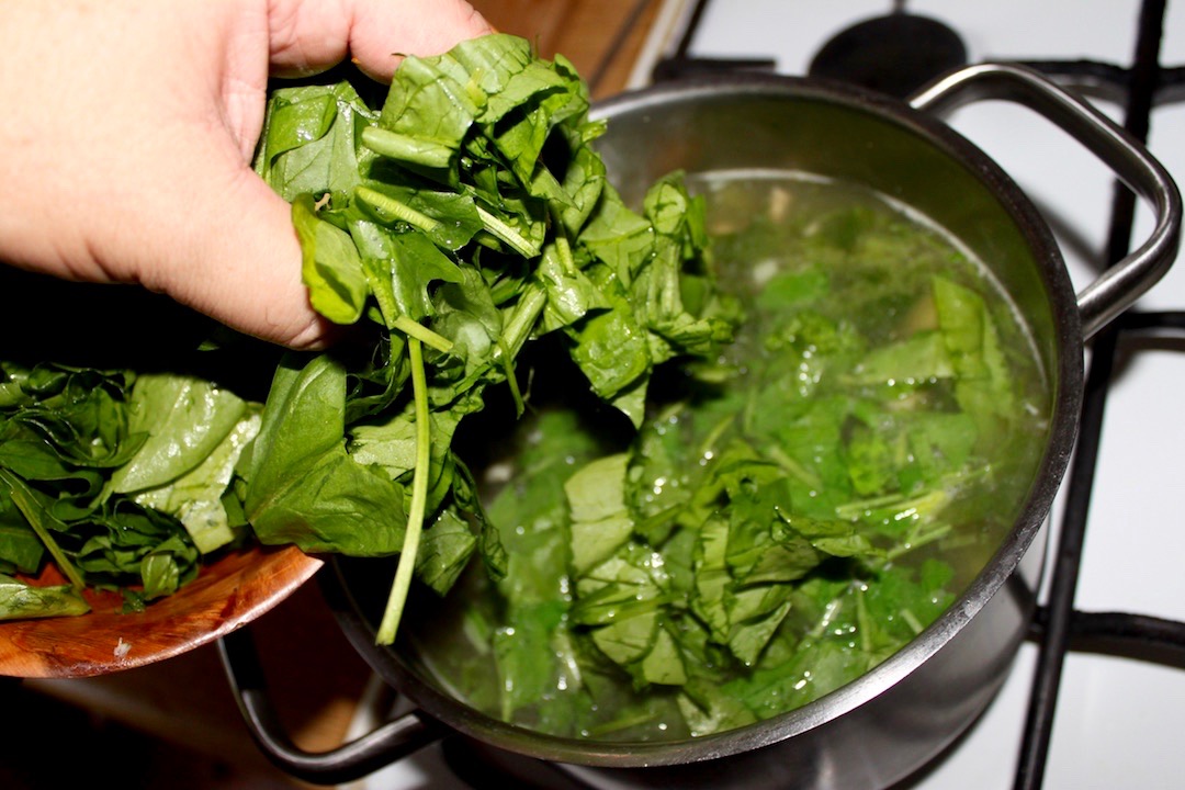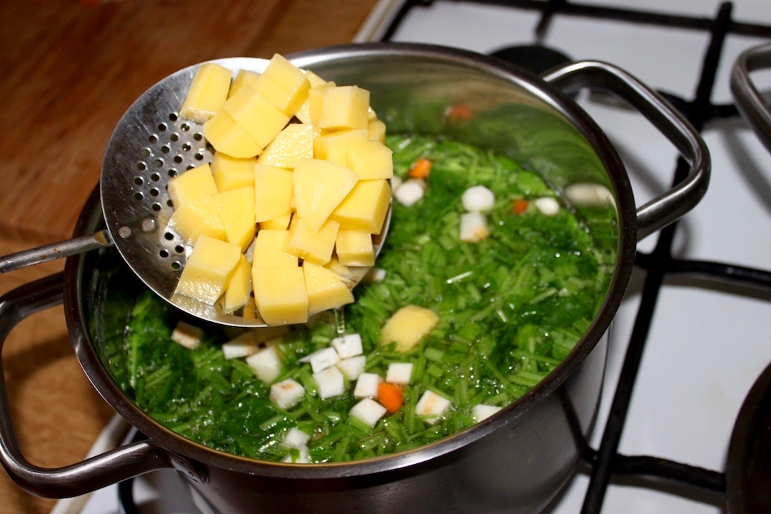 Gotowanie: Do gotującego się wywaru wrzuć najpierw posiekane łodyżki szpinaku i gotuj kilka minut. Następnie dodaj pokrojone w kostkę warzywa korzeniowe oraz ziemniaki. Gotuj, aż warzywa będą prawie miękkie (al dente).