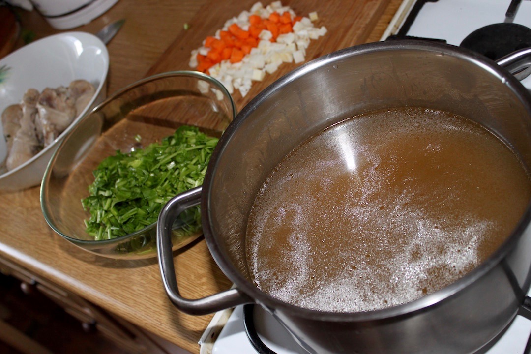 Przygotowanie wywaru: Podudzia z kurczaka umyj, włóż do garnka i zalej wodą. Dodaj obrane warzywa (jak do rosołu) i gotuj na wolnym ogniu przez około 45 minut.