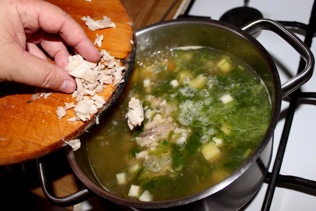 Dodanie mięsa i liści: W międzyczasie oddziel mięso kurczaka od kości i pokrój na mniejsze kawałki. Gdy warzywa w zupie zmiękną, dodaj mięso oraz liście szpinaku. Jeśli zupa jest zbyt gęsta, możesz dolać nieco wrzątku. Dopraw solą i pieprzem.