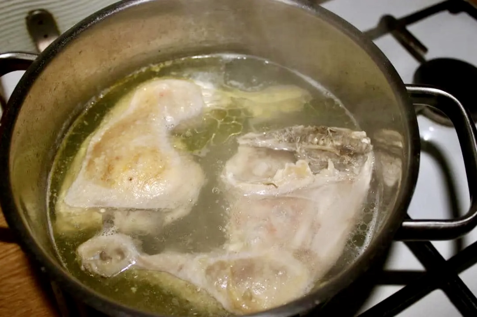Gotowanie bazy: Ćwiartki z kurczaka opłucz, włóż do garnka i zalej zimną wodą. Zagotuj, usuń szumowiny, a następnie gotuj na małym ogniu przez około 45 minut.