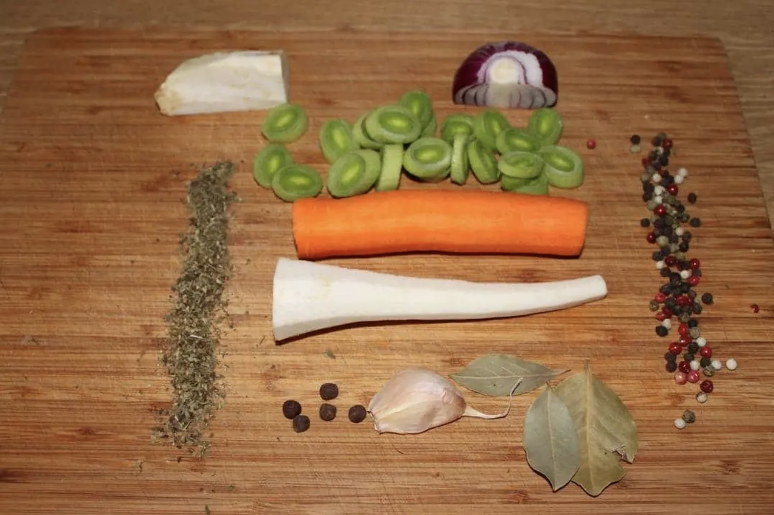 Warzywa: 1 marchewka, 1 pietruszka, kawałek pora, kawałek selera, 1-2 ząbki czosnku, kawałek cebuli (opalonej nad gazem).