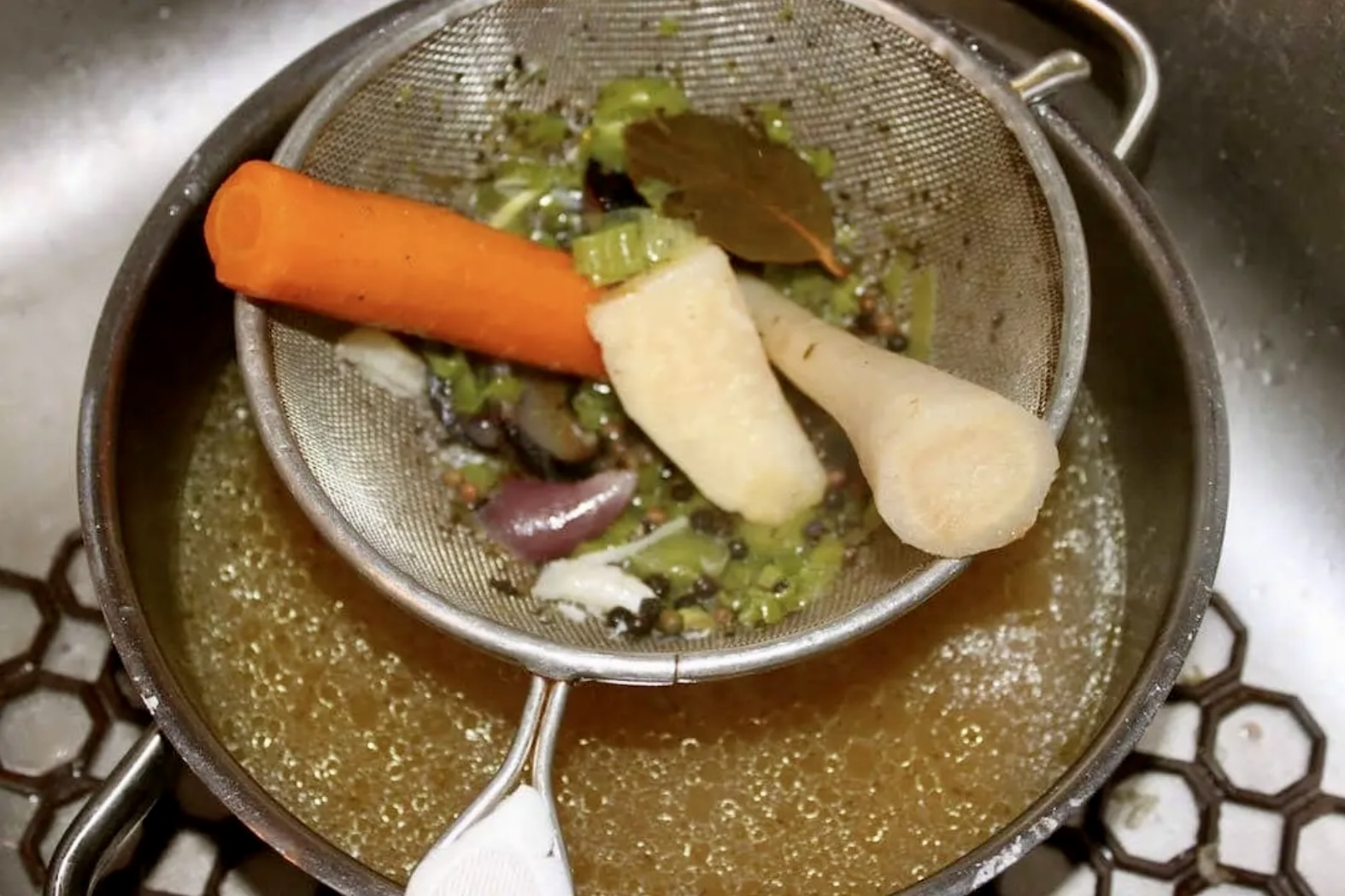 Aromatyzowanie wywaru: Do wywaru dodaj warzywa (marchew, pietruszkę, por, seler, czosnek, opaloną cebulę) oraz przyprawy (liście laurowe, ziele angielskie, pieprz, zioła prowansalskie i sól). Gotuj całość przez kolejne 15 minut.