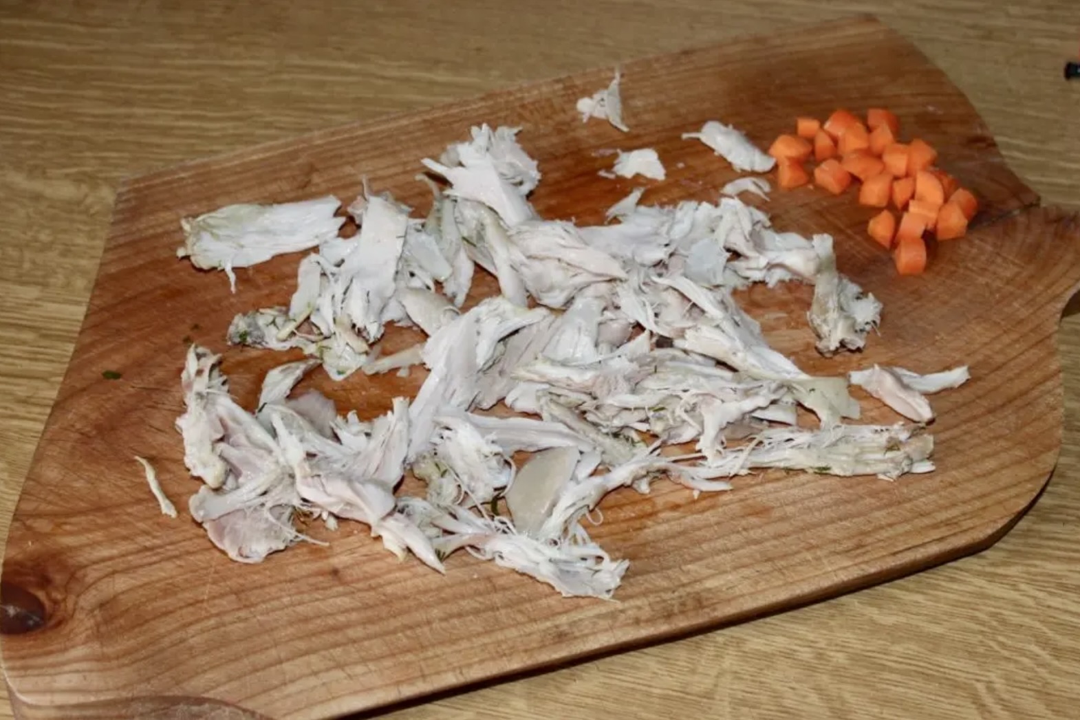 Obróbka składników: Gdy wywar jest gotowy, odcedź go (można przez gazę). Z ugotowanego kurczaka usuń kości i skórę, a mięso podziel na małe kawałki. Marchewkę pokrój w kostkę.