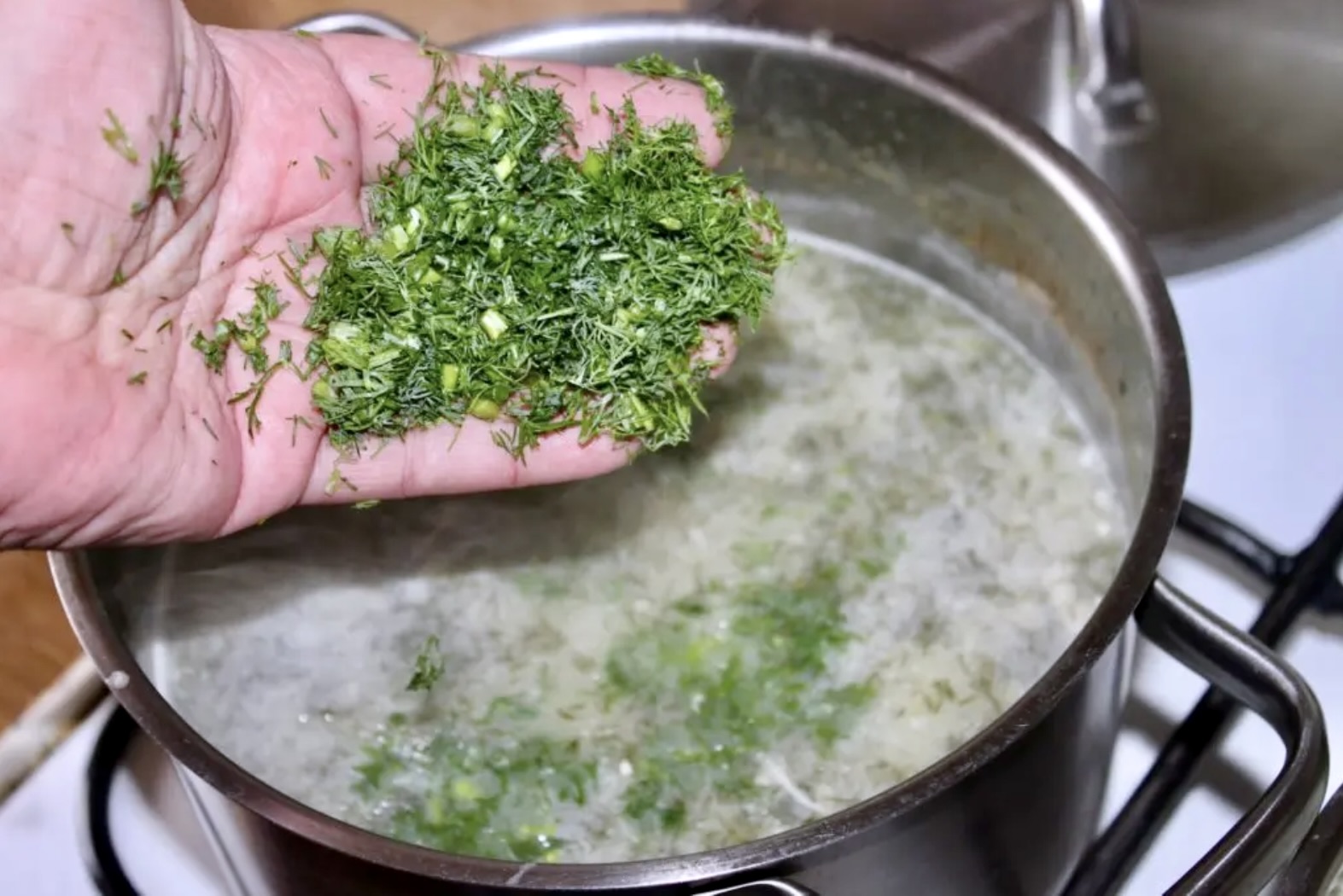 Finał: Do garnka wrzuć rozdrobnione mięso, pokrojoną marchewkę oraz dużą ilość drobno posiekanego świeżego koperku. Dodaj ugotowany wcześniej ryż. Dopraw do smaku solą i pieprzem.