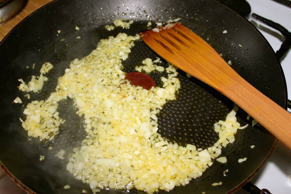 Smażenie: Na patelni rozgrzej oliwę i zeszklij cebulę (nie rumień jej). Dodaj czosnek i smaż jeszcze minutę.