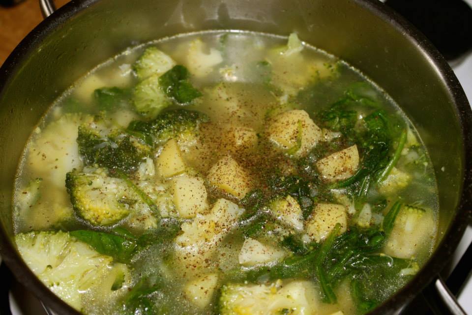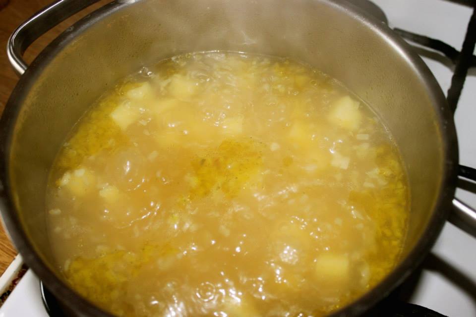 Gotowanie bazy: Przełóż zawartość patelni do wrzącego bulionu, dodaj pokrojone ziemniaki i gotuj przez 5 minut.